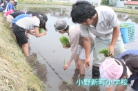 村上和之様より学習田として水田をお借りし、実際に田植えや稲刈りなどを体験させていただいています。今日は、5年生全員で田植えを体験してきました。