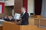本日のお昼の時間に全校集会を行いました。本日は今年度最期の表彰でした。最初は,「平成27年度土砂災害防止に関する絵画展」の表彰です。3年生男子が優秀賞を受賞しました。