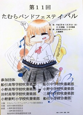 1月24日(日),吹奏楽部が「第11回たむらバンドフェスティバル」に参加しました。この演奏会は田村地区内の小・中・高校の吹奏楽部・合奏部が,日頃の練習の成果を発表するものです。今回も小野新町小学校吹奏楽部・小野中学校吹奏楽部・小野高校吹奏楽部・船引小学校合奏部・船引中学校吹奏楽部・船引高校吹奏楽部・三春中学校吹奏楽部・田村高校吹奏楽部の8団体が参加しました。