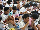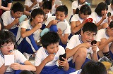 6年生が「第72回学童歯みがき大会」に参加しました。「学童歯みがき大会」は日本学校歯科医師会主催でインターネットのライブ配信を利用して全国の小学生が参加します。6年生は配信される映像を見ながらクイズに答えたり,鏡で自分の歯茎の様子を確認したりしながら,歯や口の健康について学習しました。