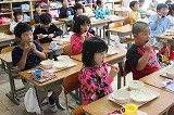 給食の後に各教室を回ってみると,歯みがき教室で使用した鏡を使って口の中を見ながら,しっかりと歯みがきをしていました。