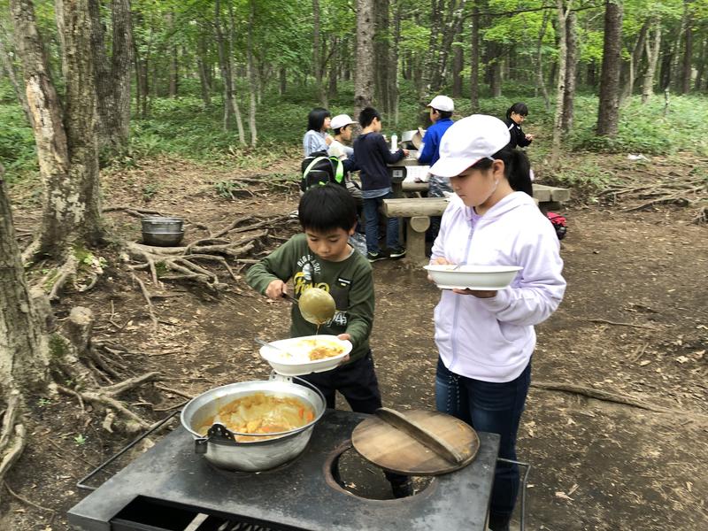 朝早くから、宿泊している全ての団体が集い、ラジオ体操に取り組みました。また、心配された天気も少し風があったものの雨は降らず、野外炊飯、スコアテーリングとも予定通り実施できました。どの班も活動する中で協力することの大切さを感じている様子が見られました。