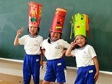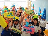 2年生の図画工作科「ぼうしをかぶって」の学習では,色画用紙や色紙を使ってカラフルな帽子を作る学習を行いました。作り終わると,それぞれ帽子をかぶって発表会を行いました。