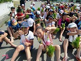 いよいよ田植え開始です。初めは戸惑っている様子も見られましたが,次第に慣れ,目印の縄に沿って上手に植えることができました。