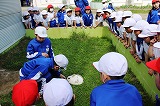 生き物委員会がウサギの世話を始めると,たくさんの1年生がウサギ小屋の周りに集まりました。6年生の生き物委員さんが1年生にウサギを触らせてあげていました。1年生はとても喜んでいました。