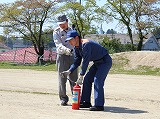6年生の代表児童が水消火器で消火訓練を行いました。