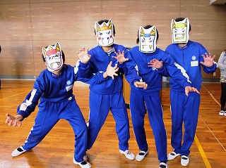 最後に年男・年女による豆まきが行われました。集会委員会の6年生が手作りのお面をかぶり,鬼の役をしました。