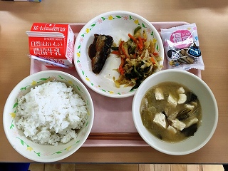 給食も「節分献立」でした。水煮の大豆(打ち豆)が入った「豆まめ味噌汁」や「いわしの梅煮」など節分に関係のある大豆やいわしなどを使った,栄養満点のおいしい給食でした。