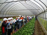 吉田農園では,トマトやちぢみほうれん草・お米などを育てており,黒ニンニクの製造や販売も行っているそうです。子どもたちはトマトやホウレンソウの様子を見学させていただいたり,野菜作りの工夫や苦労について,お話を聞かせていただいたりしました。大きなビニールハウスは長さが50m近くあり,3年生58名が一度に全員入れる程でした。