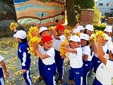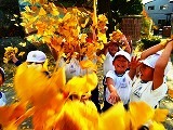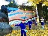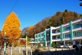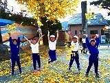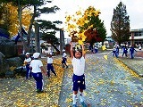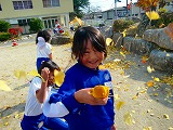 校舎前のイチョウがきれいに紅葉しています。今日は,時折強い風が吹いていたので,イチョウの木の周りには黄色い葉がたくさん落ちていました。昼休みには子どもたちがイチョウの葉を投げ上げて,「イチョウのシャワー」をしたり,葉を何枚か合わせて「黄色いバラの花」を作ったりして遊んでいました。