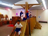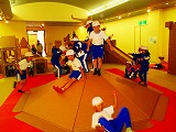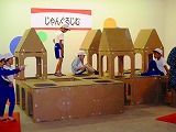 ダンボールでできた作品ですが,子どもたちが乗ってもびくともせず,大変頑丈にできています。2年生61名みんなで楽しむことができました。