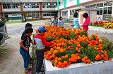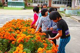 校舎前の花壇に,5年生や生き物委員の皆さんが植えた花が,とてもきれいに咲いています。PTA奉仕作業の際にも除草をしていただき,普段は用務員さんがお手入れしてくださっています。先日は用務員さんがお手入れをしている様子を見て,3・4年生の子どもたちがお手伝いをしていました。
