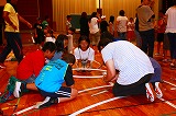その後,班ごとに分かれて「校内オリエンテーリング」と「ふれあいゲーム」を交代で行いました。「校内オリエンテーリング」では,薄暗くなった校舎の中を班ごとに探検しました。5年半通っている校舎ですが,昼間の校舎とは違う印象だったようです。