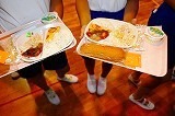 みんなであいさつをして食べ始めました。自分の取り分けたメニューと友達の取り分けたメニューを比べたり,それぞれの料理の感想を言ったりしながら楽しく食べることができました。取り分けた分を食べ終えた子どもは,どんどんおかわりをしていました。