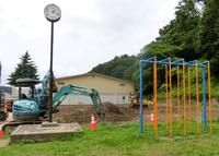 夏休みに入り、統合に向けた改修工事が進められています。プール解体、玄関改修、西校舎教室改修、トイレ便器改修が現在行われています。プール解体は、夏休み前から始まり、撤去作業が完了しました。今後舗装工事が予定されています。