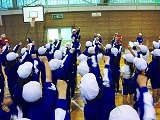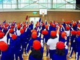 応援係で考えた紅・白それぞれのエールを,全校生で練習しました。