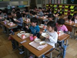 1年1組・2組,あすなろ1組・杉の子には,たくさんのお父さん・お母さんがいらっしゃり,子どもたちはお父さんお母さんと一緒においしく,楽しく給食を食べていました。
