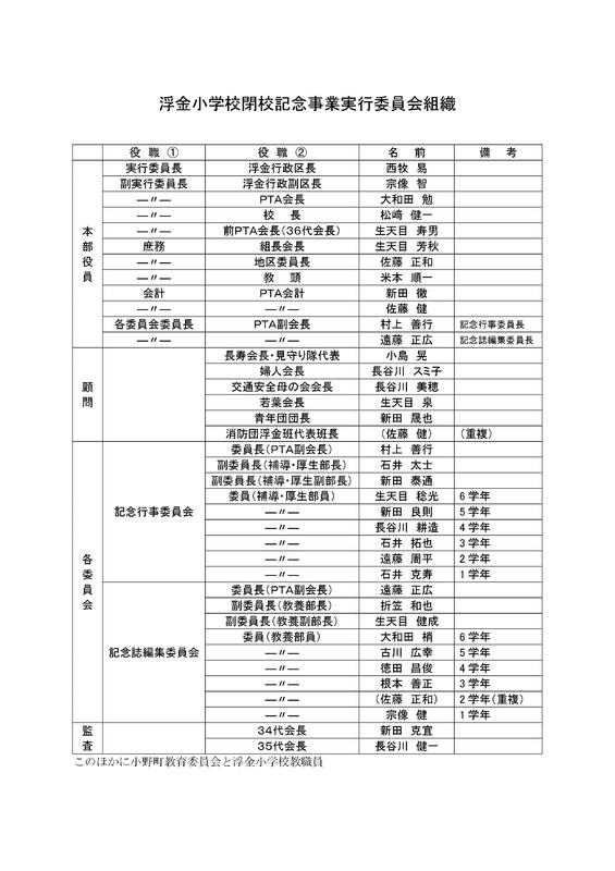 閉校に向けて,浮金地区でも浮金小学校閉校記念事業実行委員会が組織され,閉校関連事業の企画,準備,運営の中心を担います。