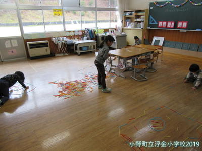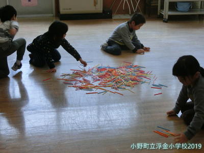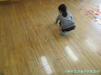 1年生の図工です。今日は数え棒を大量に使った造形活動です。