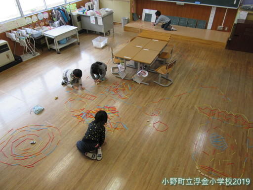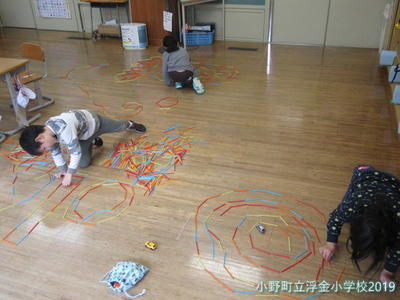 とにかくつないでのばしていく子ども、渦巻き状に並べる子ども、つくりたい形をつくる子どもそれぞれに並べる活動が始まります。