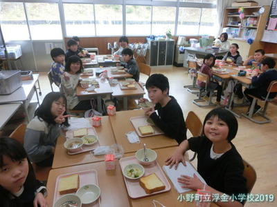本日の給食のテーマ「手作りを味わおう」ということで手作りシュガートースト、ワンタンスープ、ベーコンポテトサラダでした。