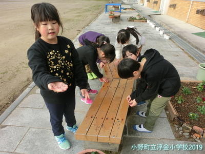 石畳のベンチでは2年生が薄氷を発見して大賑わいです。