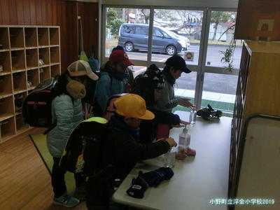 学校では、手洗い・うがいの励行、換気などとともに登校後昇降口で手のアルコール消毒をしています。