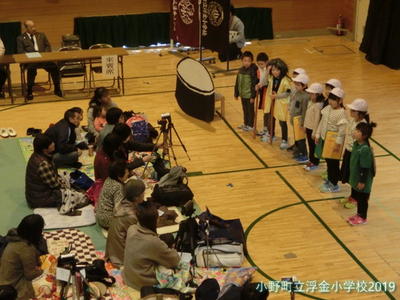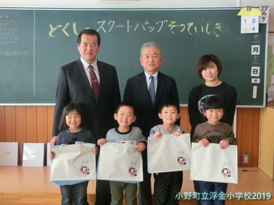 読書スタートバッグ贈呈式 たくさん本を読みます!! 1年生