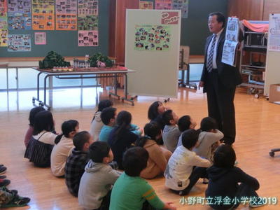 続いて校長先生のお話です。今回も、新聞を手に話をしました。