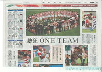 ラグビーについては「熱狂 ONE TEAM」との見出しから、協力すること、一つになることから学習発表会の取組で、今できることをしっかりやっていこう。(写真は「福島民友 2019年11月5日(火)」より)