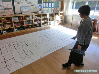 1年担任が息を切らしながら、模造紙を貼り合わせた大きな紙に線を引いています。
