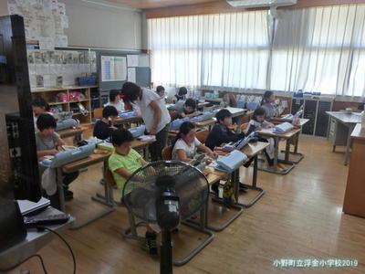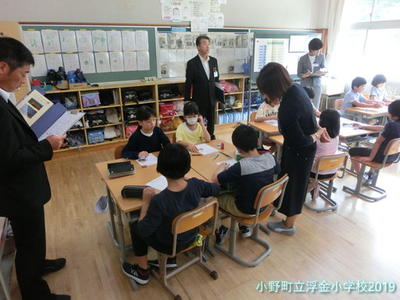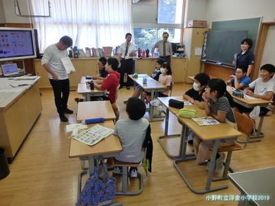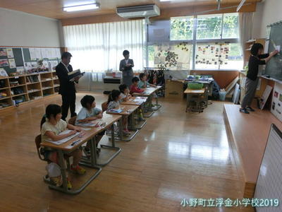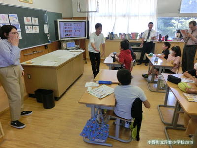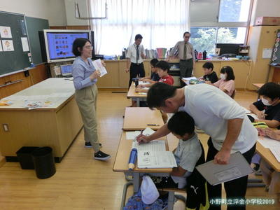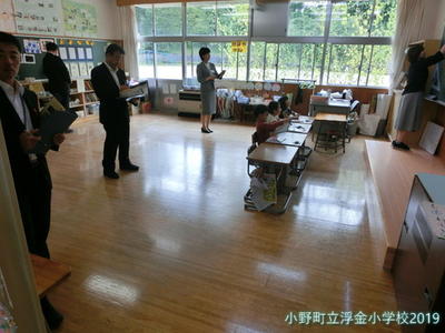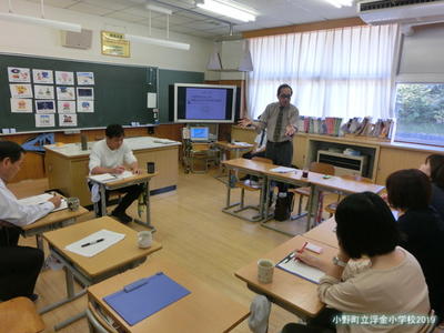 県中教育事務所から所長、業務次長、指導主事に来校いただき、浮金小学校の学校経営について説明し、授業を参観していただきました。