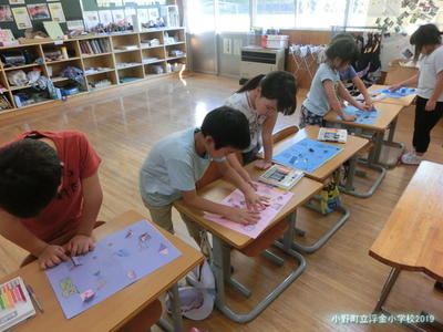 2年生は、図画工作科でした。カッターで色画用紙に切り込みを入れて窓をつくる題材でした。