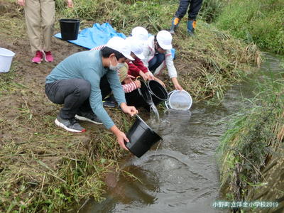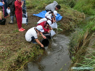子どもたちは、縦割り班ごとに夏井川の水辺まで近づき、バケツに入れたヤマメの稚魚を放流しました。