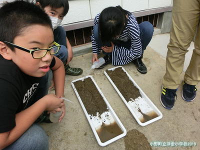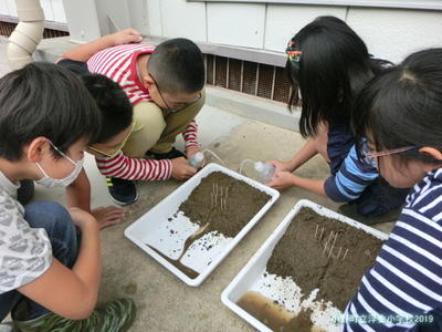 土と砂を混ぜ、バットに敷き詰めて、いざ実験開始です。