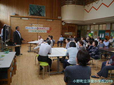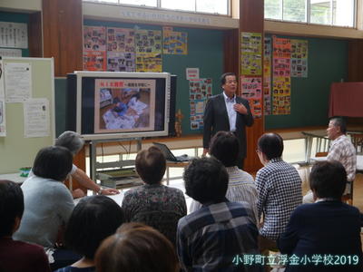 校長が祖父母の皆さんに浮金小学校についてスライドを使って説明しました。