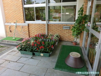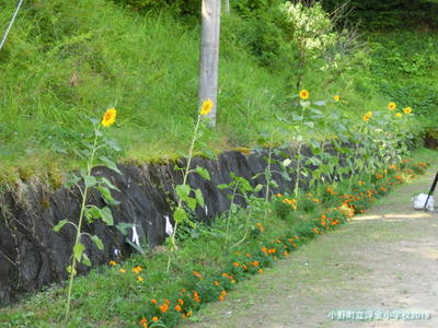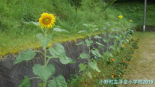 さて、校庭南側に植えたひまわりたちが、やっと咲き始めました。