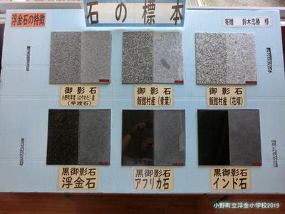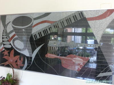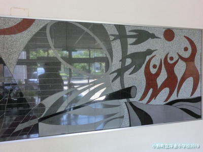 浮金小学校の昇降口には、石組みの大きな壁画があります。