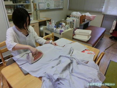保健室では,養護教諭が給食着を1枚1枚アイロンがけしながらたたんでいました。
