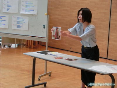 背骨が歪むとはどういう状態か,どのような影響があるのか,養護教諭が説明しました。
