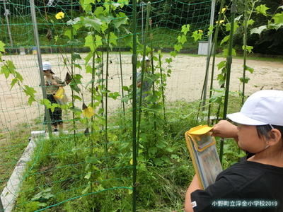 ヘチマは,7月に比べて驚くほど成長しました。子どもたちも嬉しいようです。