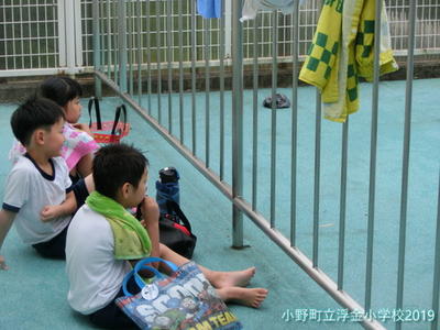 少し早めに上がった1年生は,5・6年生が全力で泳ぐ姿を見つめていました。