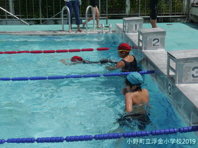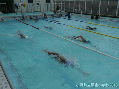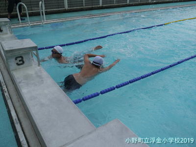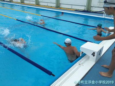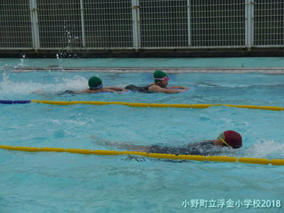 5・6年生は自分の決めた泳ぎ方を練習します。最後には,本日のタイムを計ります。