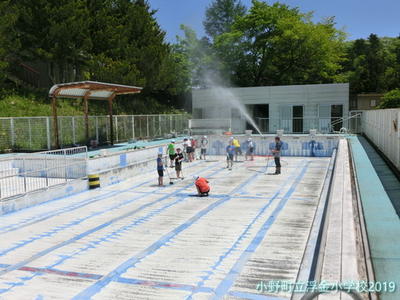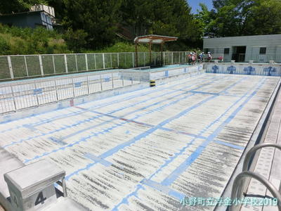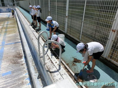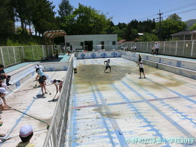 プールの中は,4~6年が担当し,プールの底や壁をブラシで磨きました。