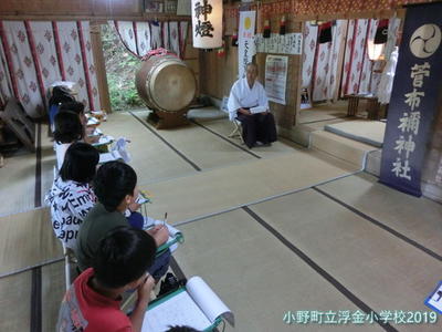 本日は,菅布禰神社について神主さんから子どもたちの質問に答える形でいろいろと教えていただきました。