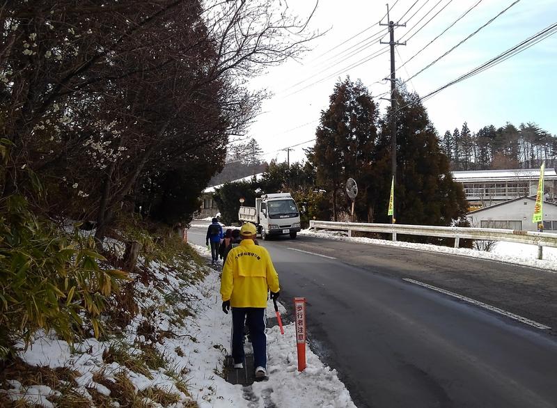 通勤等で県道を走る運転手の皆さん。子どもたちの姿が見えたら減速し、対向車がある場合は徐行するようお願いします。