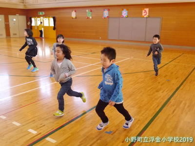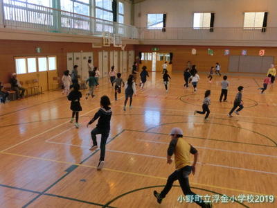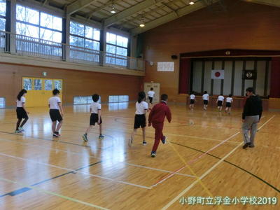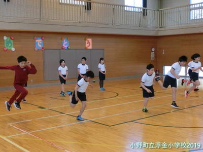 まずは,慣らしの動きです。スキップやサイドステップなど体育科の中でも行っている様々な運動をしました。