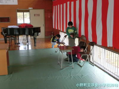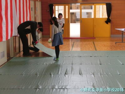 朝,5・6年生と職員で前日の入学式会場の片付けを行いました。