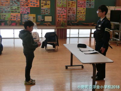 いつも歩く道だからといって安心しないこと,道路に出るところでは必ず安全確認すること,信号機のところでの止まってくださった車へのあいさつは立派であることなどのお話をいただきました。