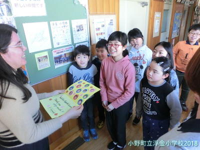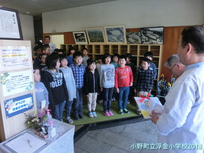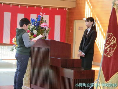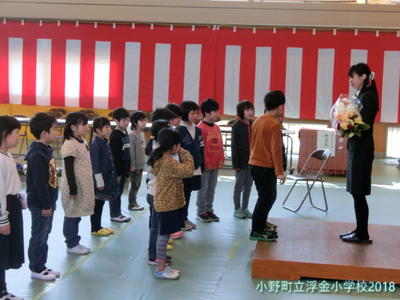 離任式では,代表児童から「お別れのことば」が伝えられ,2年生から「大好きです。」「ありがとうございました。」の言葉と涙とともに花束が手渡されました。